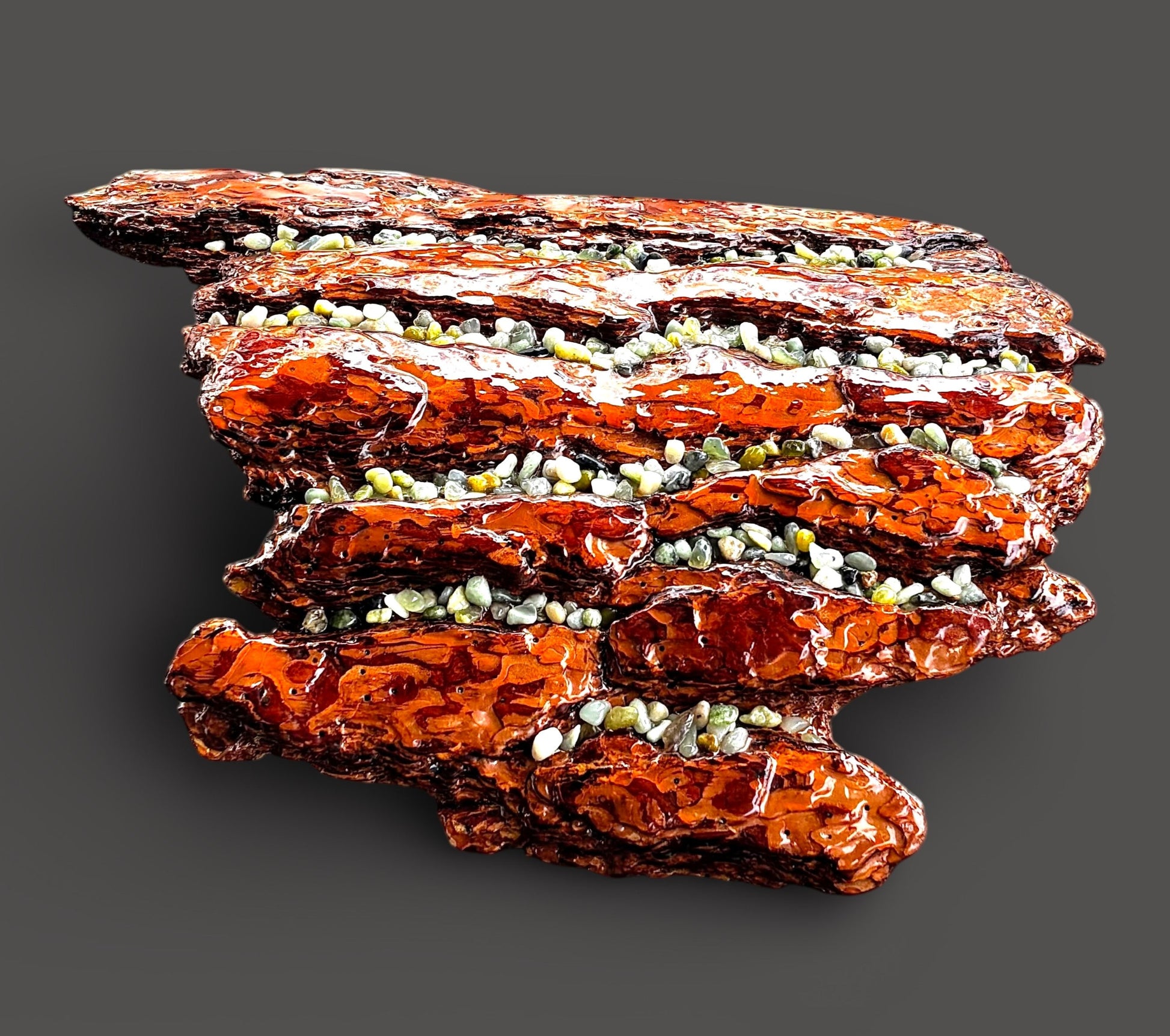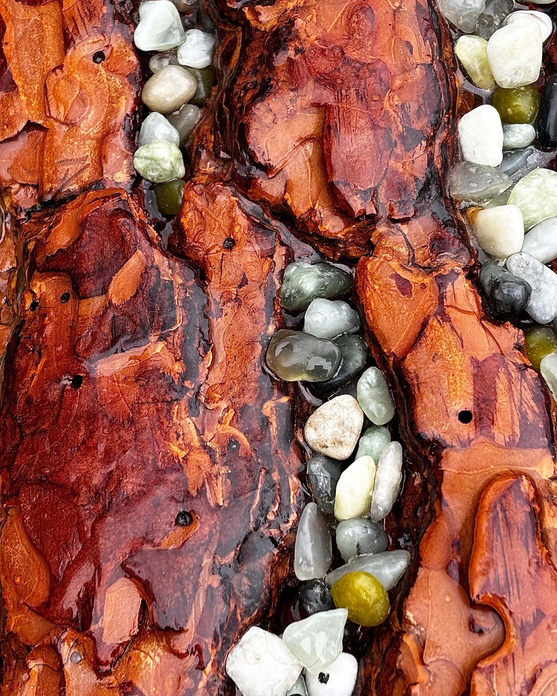 A functional tabletop piece formed from fire salvaged whole bark.