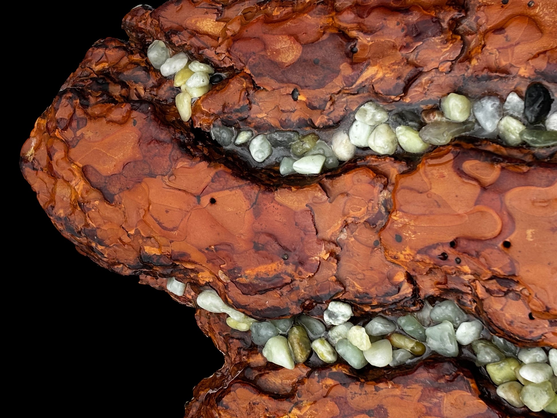 Natural charred fissures are inlaid with green river stone, while the top surface is hand leveled to support an 8" potted plant. Preserved, sealed, and left intentional, Alvsten balances material integrity with practical use.