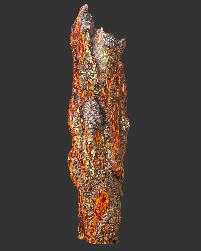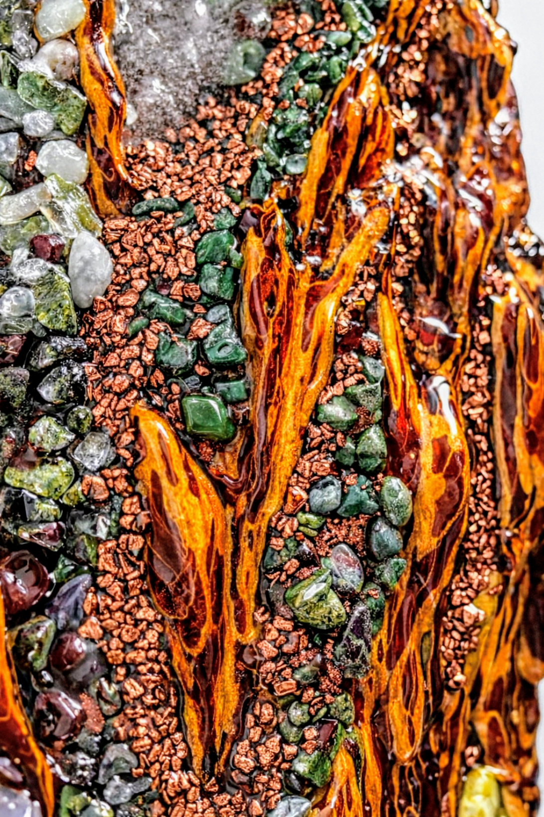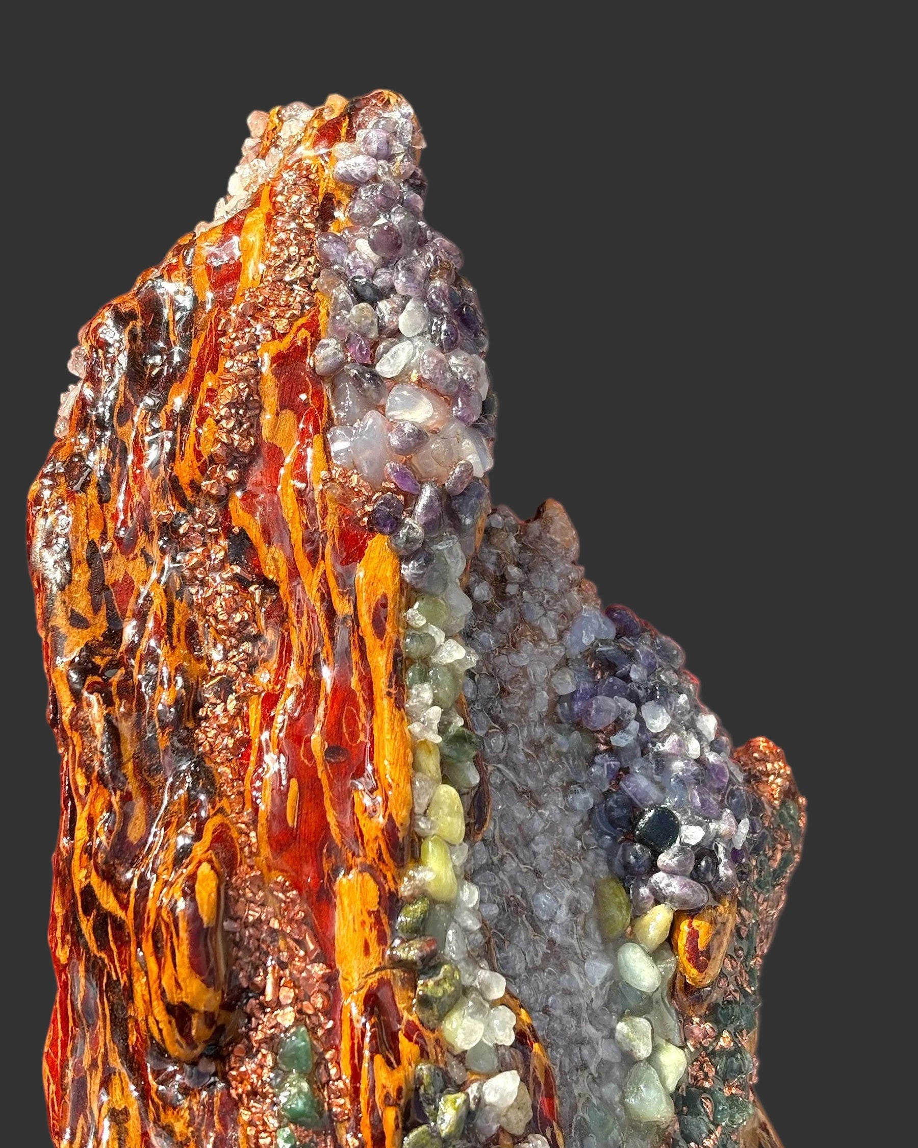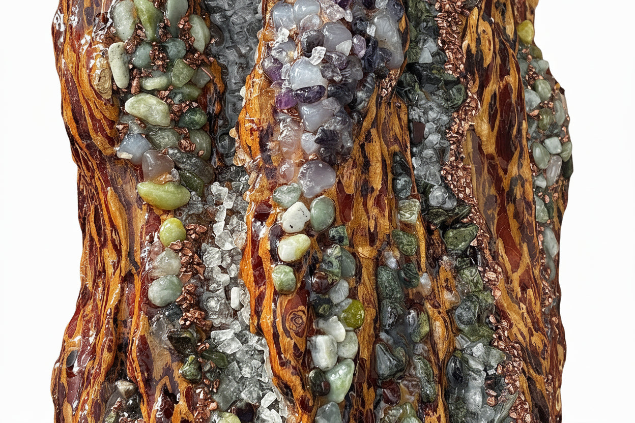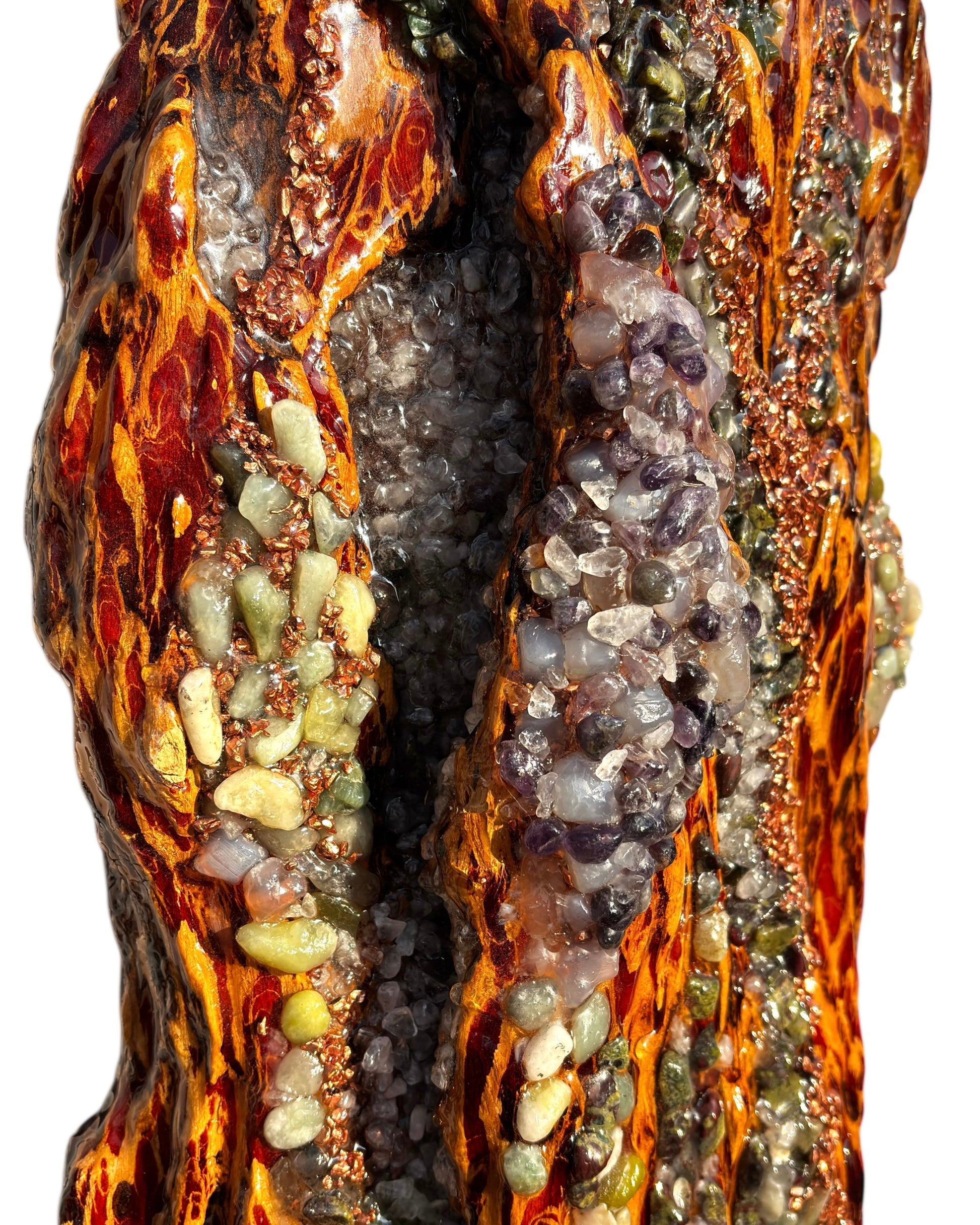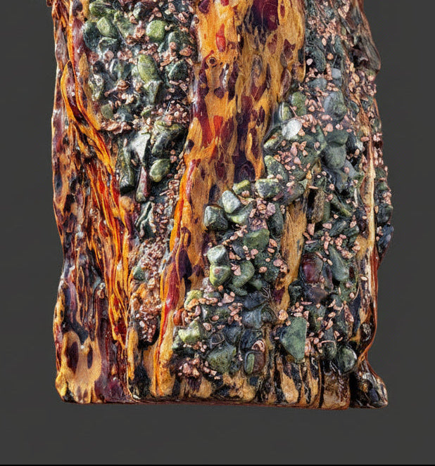 Gemstones are integrated with precision, following the organic flow of the exposed bark. Amethyst, jade, clear agate, and green aventurine are set into the surface as mineral accents, adding texture and light without interrupting its rugged form as ;much as possible.